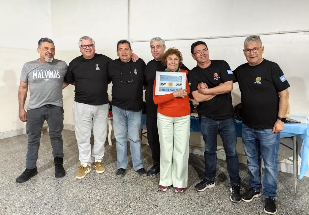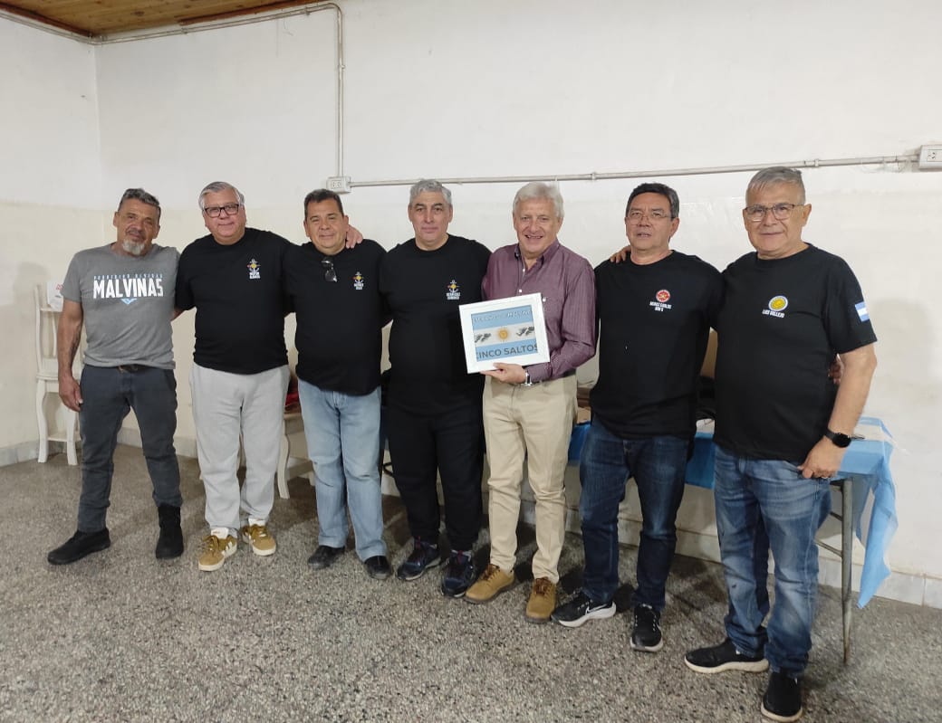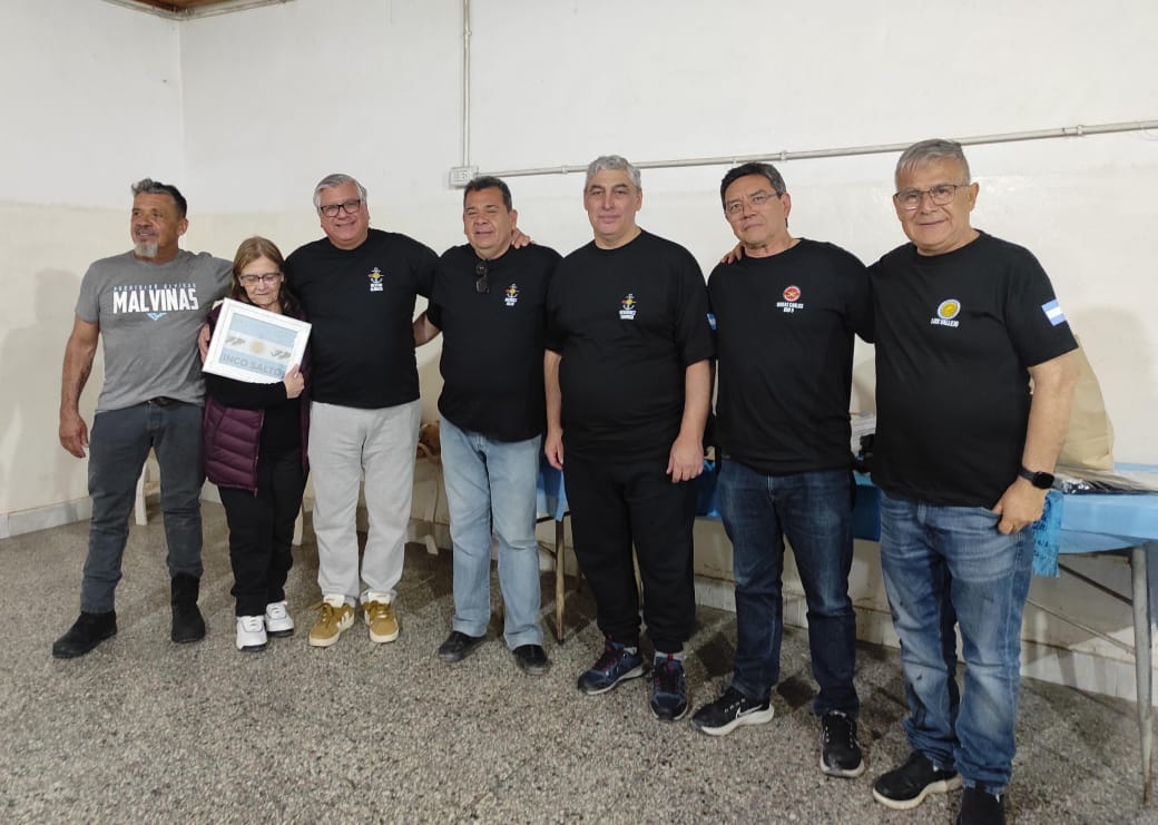 En un momento de la reunión se invitó a autoridades del Cuartel de Bomberos a hacerse presentes para recibir un presente consistente en una bandera Argentina firmada por los Veteranos en reconocimiento y agradecimiento por la colaboración de esa Institución.